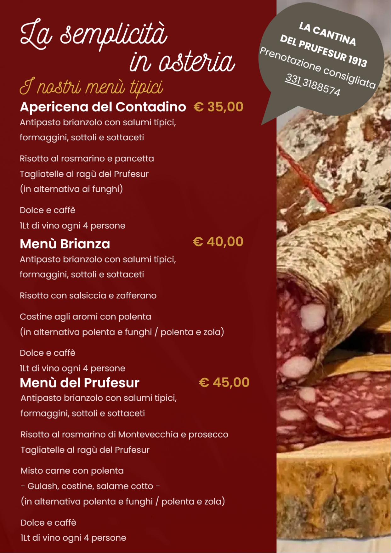 Dal Prufesur riscoprirete il gusto per i prodotti della tradizione brianzola con squisiti taglieri di affettati e formaggi locali. Serviamo piatti tipici da consumare nel contesto paesaggistico e naturale del Parco del Curone.